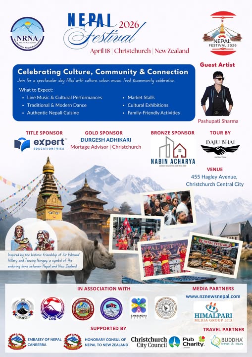 एनआरएनए न्युजिल्याण्डले आगामी अप्रिल १८ मा न्युजिल्याण्डको क्राइस्टचर्च सहरमा आयोजना गर्न लागेको ‘नेपाल फेस्टिभल २०२६’ को तयारी तीव्र रूपमा अघि बढेको छ । नेपाली संस्कृति, समुदाय र आपसी सम्बन्धलाई प्रवर्द्धन गर्ने उद्देश्यले महोत्सव आयोजना गर्न लागिएको हो ।