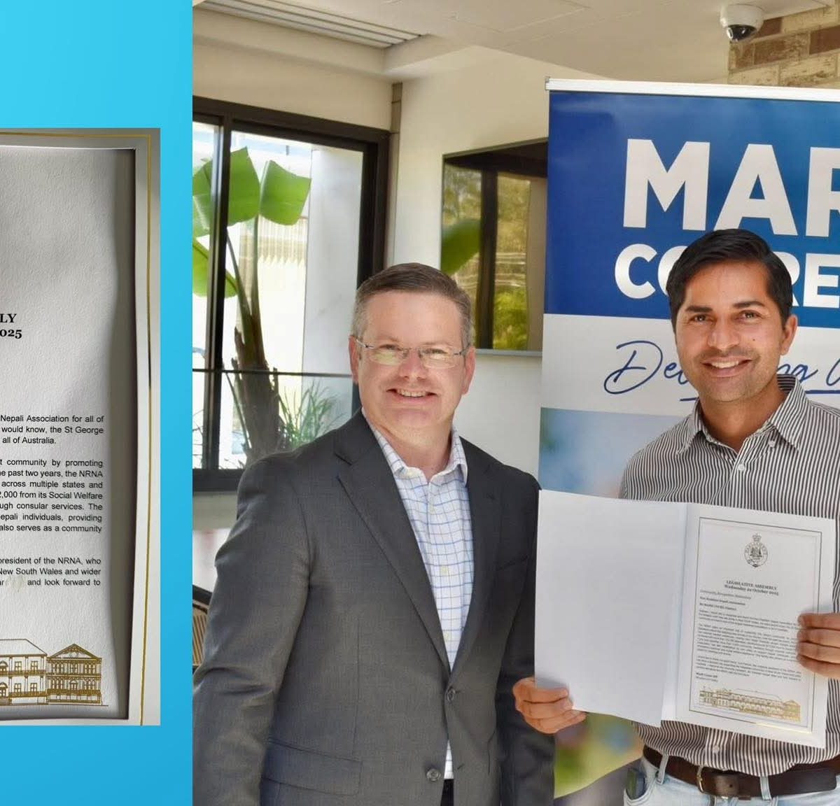 २२ अक्टोबर २०२५ मा संसदमा सम्बोधन गर्दै सांसद मार्क कुरेले एनआरएनए अष्ट्रेलियाले सामाजिक एकता, सांस्कृतिक प्रवर्द्धन र आपसी सहकार्यमा खेलेको भूमिकाको प्रशंसा गर्नुभएको थियो। उहाँले संस्थाका निवर्तमान अध्यक्ष अनिल पोखरेलप्रति विशेष धन्यवाद व्यक्त गर्दै उहाँको नेतृत्वमा समुदायले उल्लेखनीय उपलब्धि हासिल गरेको बताउनुभयो।
