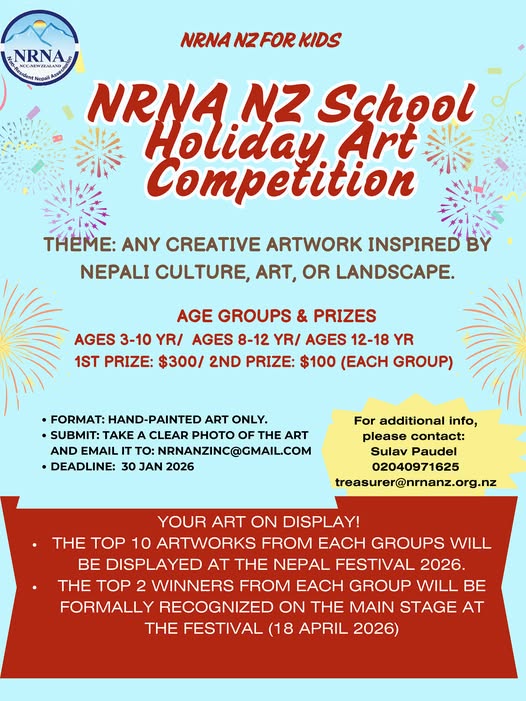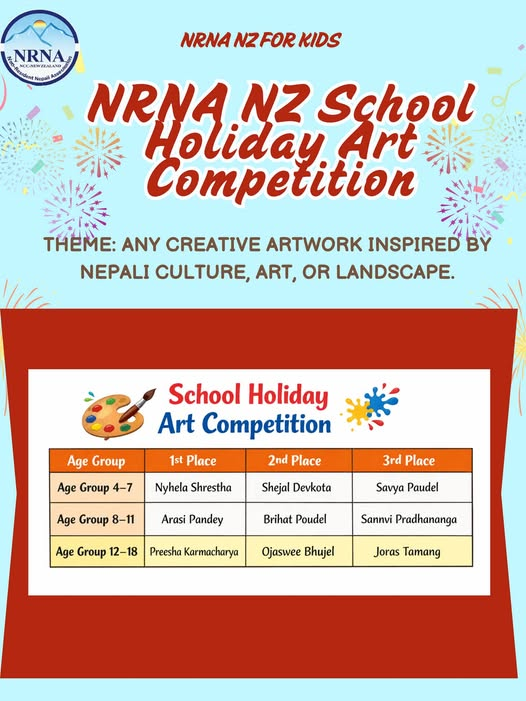 एनआरएनए न्युजिल्याण्डले न्युजिल्याण्डभर आयोजना गरिएको ‘स्कूल होलिडे आर्ट प्रतियोगिता’को नतिजा सार्वजनिक गरेको छ। एनआरएनए न्युजिल्याण्डका अनुसार प्रतियोगितामा देशभरबाट ५० वटा चित्रकला प्राप्त भएका थिए।