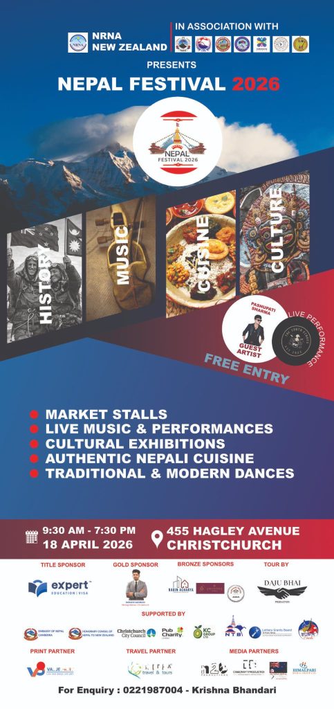 न्युजिल्याण्डको क्राइस्टचर्च शहर यतिबेला नेपालमय बनेको छ। शहरका साना–ठूला होटल, रेष्टुरेन्टदेखि पुस्तकालयसम्म आगामी शनिबार हुने नेपाल फेस्टिभलको चर्चा हुने गरेको छ। मानिसहरूको जमघट हुने हरेक स्थानमा नेपाल फेस्टिभलका प्रचार सामग्रीहरू राखिएका छन्।