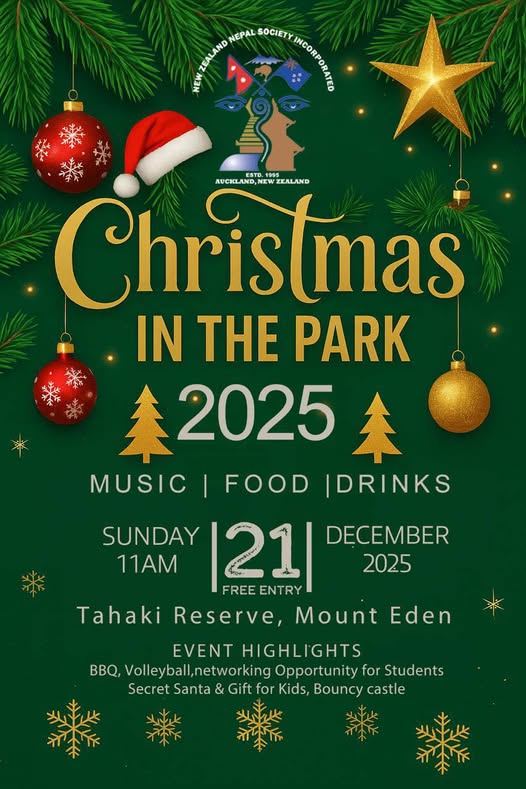 न्यूजील्याण्ड–नेपाल सोसाइटीले आगामी २१ डिसेम्बर २०२५, आइतबार ‘क्रिसमस इन द पार्क’ कार्यक्रम आयोजना गर्ने भएको छ। बिहान ११ बजेपछि सुरु हुने उक्त कार्यक्रममा सहभागी हुन सबै नेपाली समुदायलाई सोसाइटीले एक सूचना मार्फत आग्रह गरेको छ।