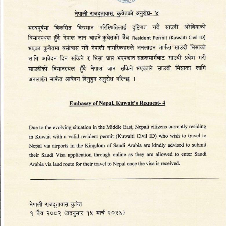 नेपाली दूतावास कुवेत को आग्रह: नेपाल फर्किन चाहने नेपालीलाई साउदी हुँदै यात्रा गर्न सुझाव
