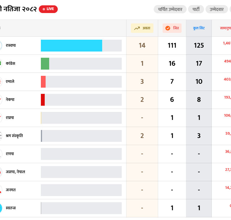 निर्वाचन परिणाममा राष्ट्रिय स्वतन्त्र पार्टीको भारी मतका साथ अग्रता, अन्य दल पछि पछि (मत परिणाम सहित)
